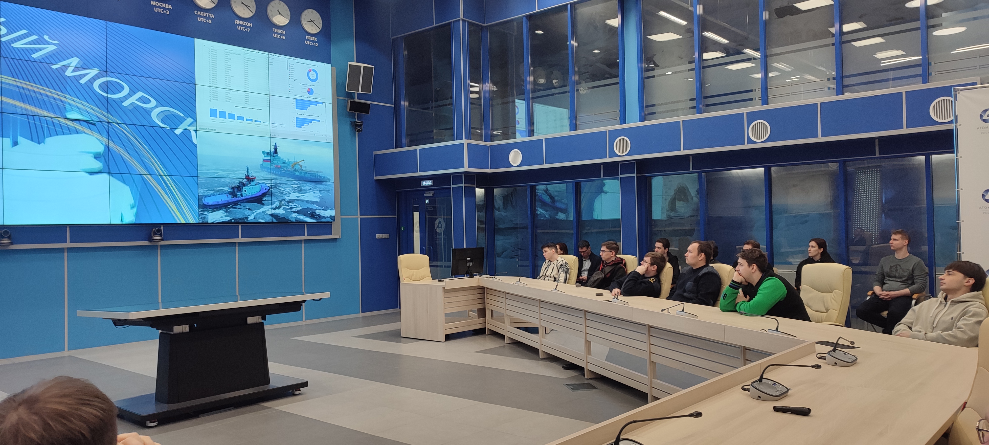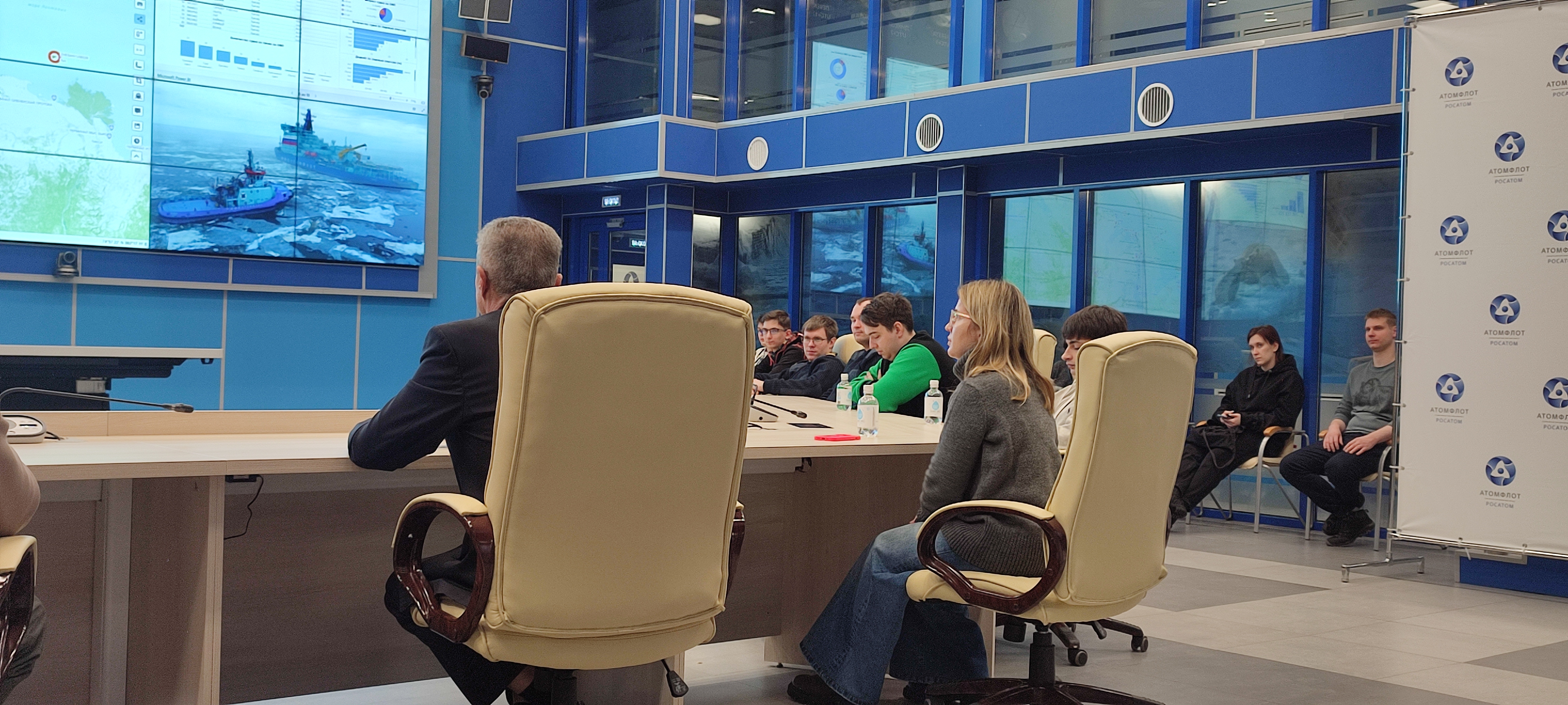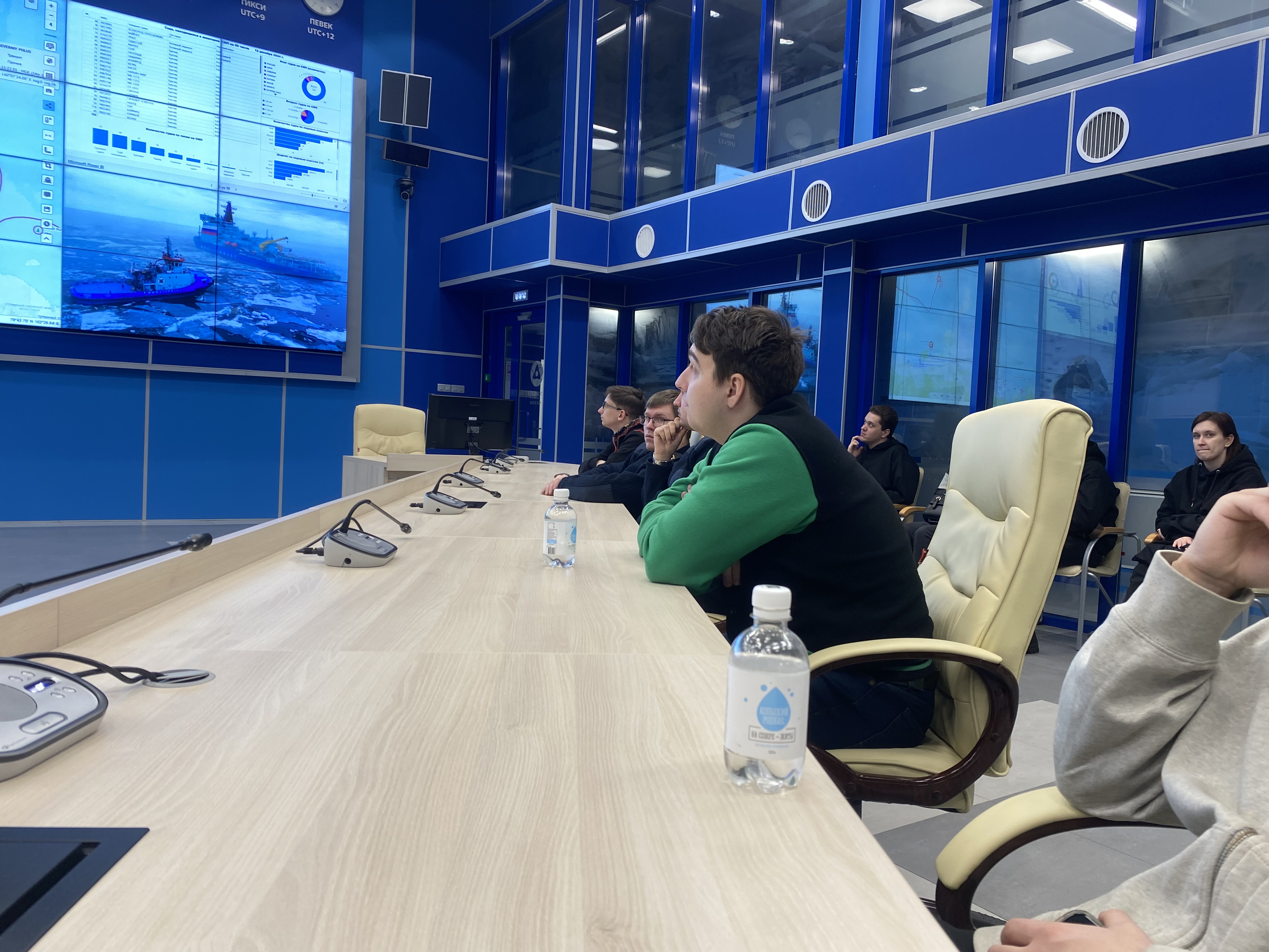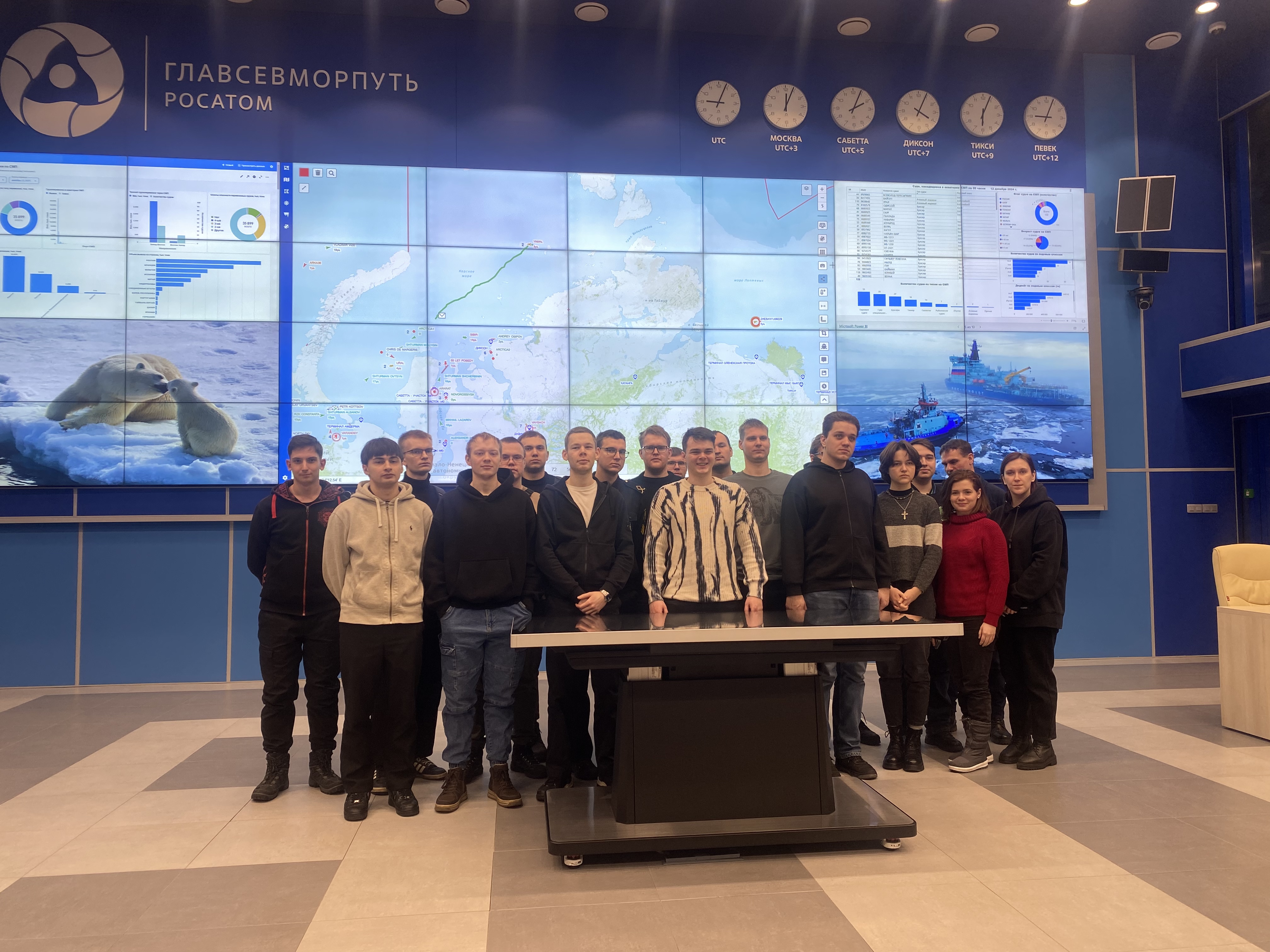 Он рассказал о том, как сам ходил в море капитаном ледокола «Вайгач» и наглядно продемонстрировал студентам возможностями ситуационного центра штаба морских операций ФГБУ «ГлавСевморпуть», где можно в режиме реального времени наблюдать не только местоположение всех атомных ледоколов и контролировать их перемещение, но и получать в онлайн режиме спутниковые данные о ледовой обстановке на Северном морском пути, высоту волны, силу и направление ветра, другие погодные характеристики. Студентам показали, как оценивается состояние льда при помощи спутниковой съемки и с камер, размещенных на судах.