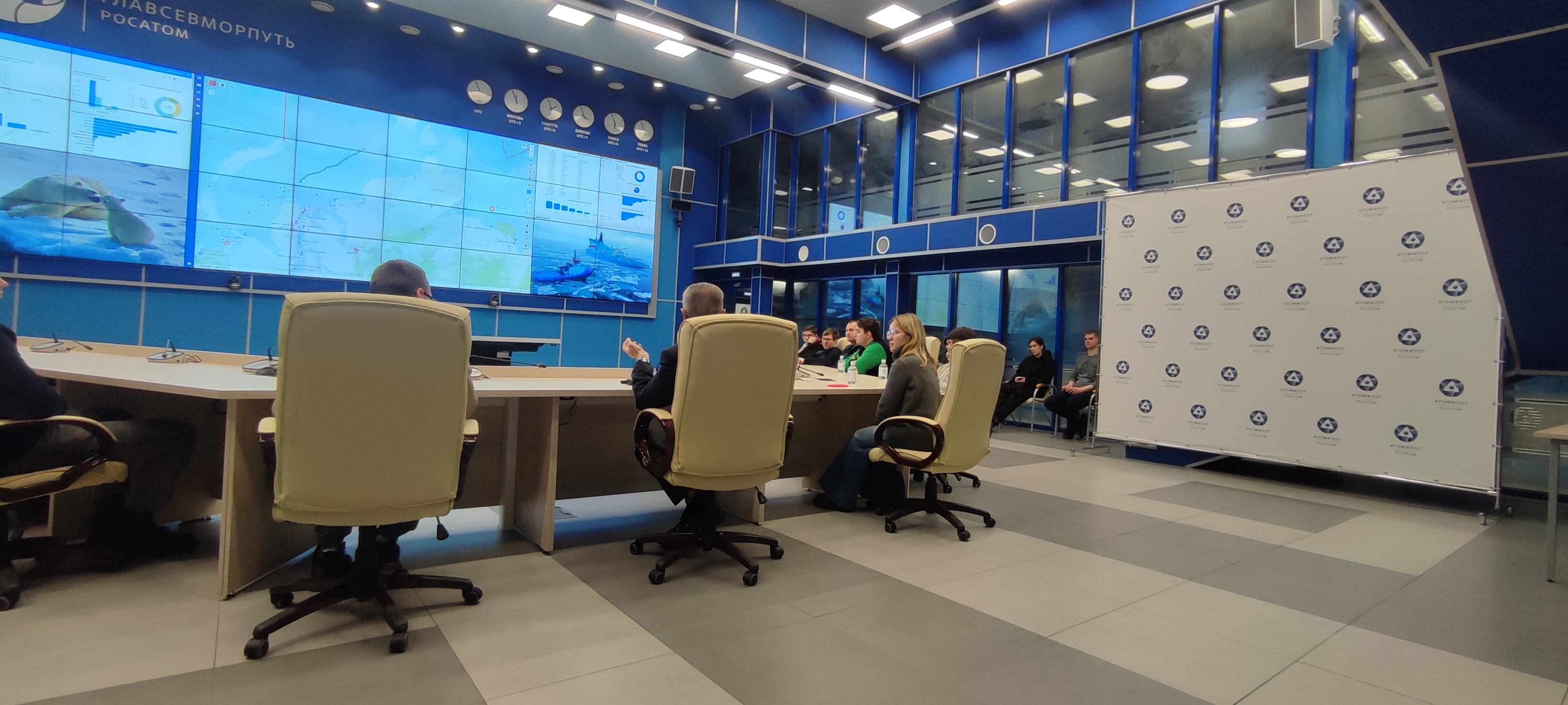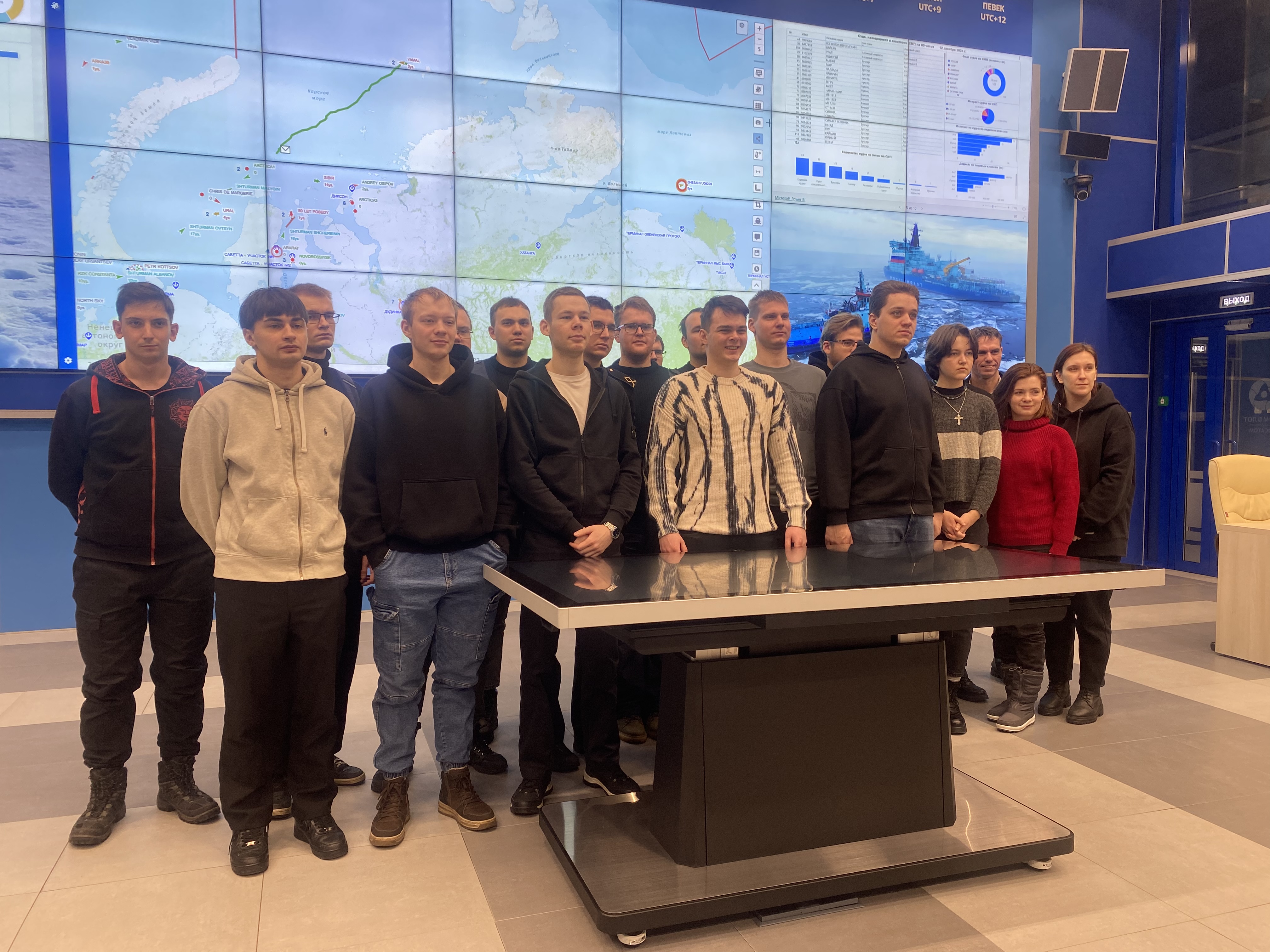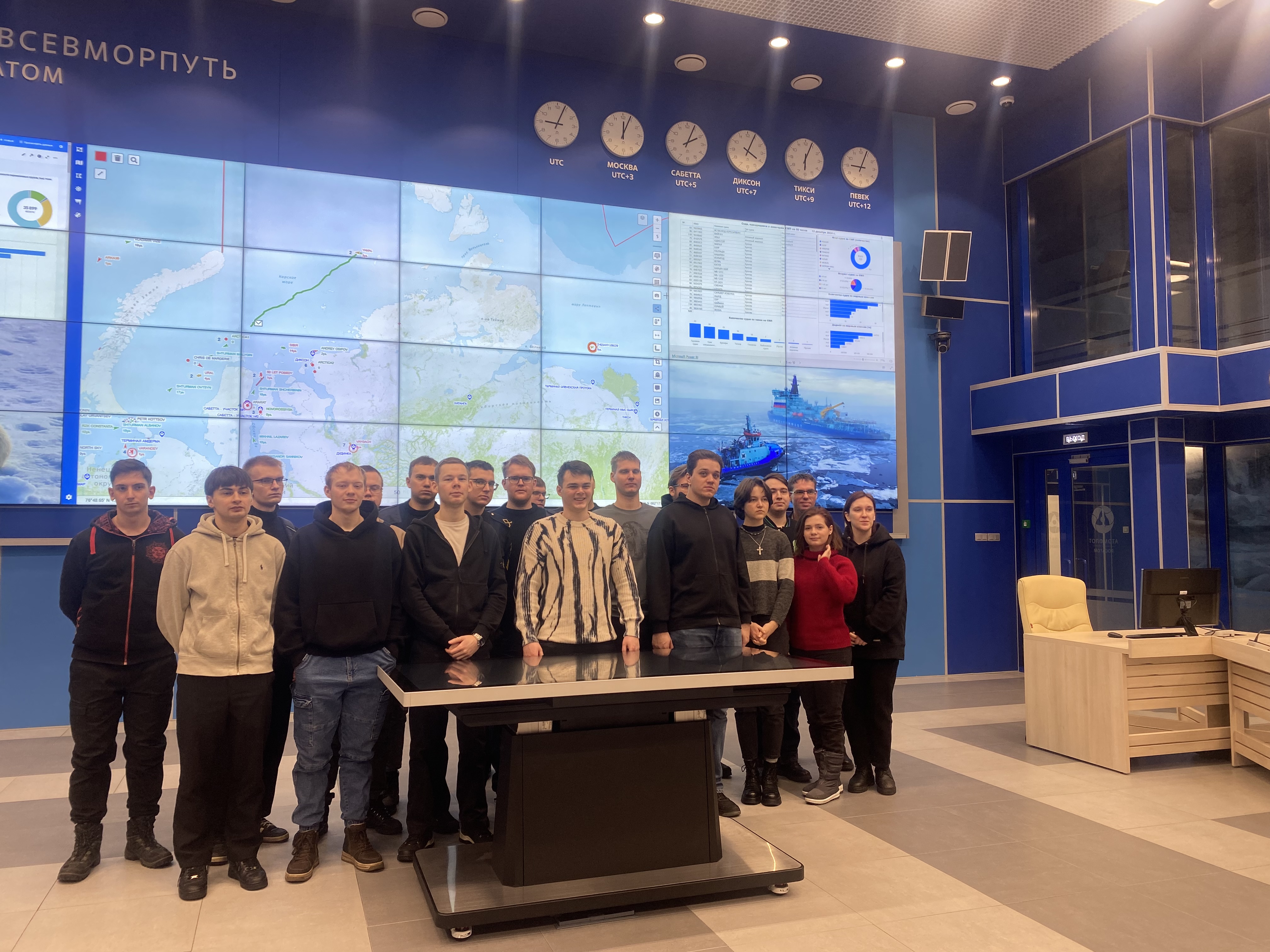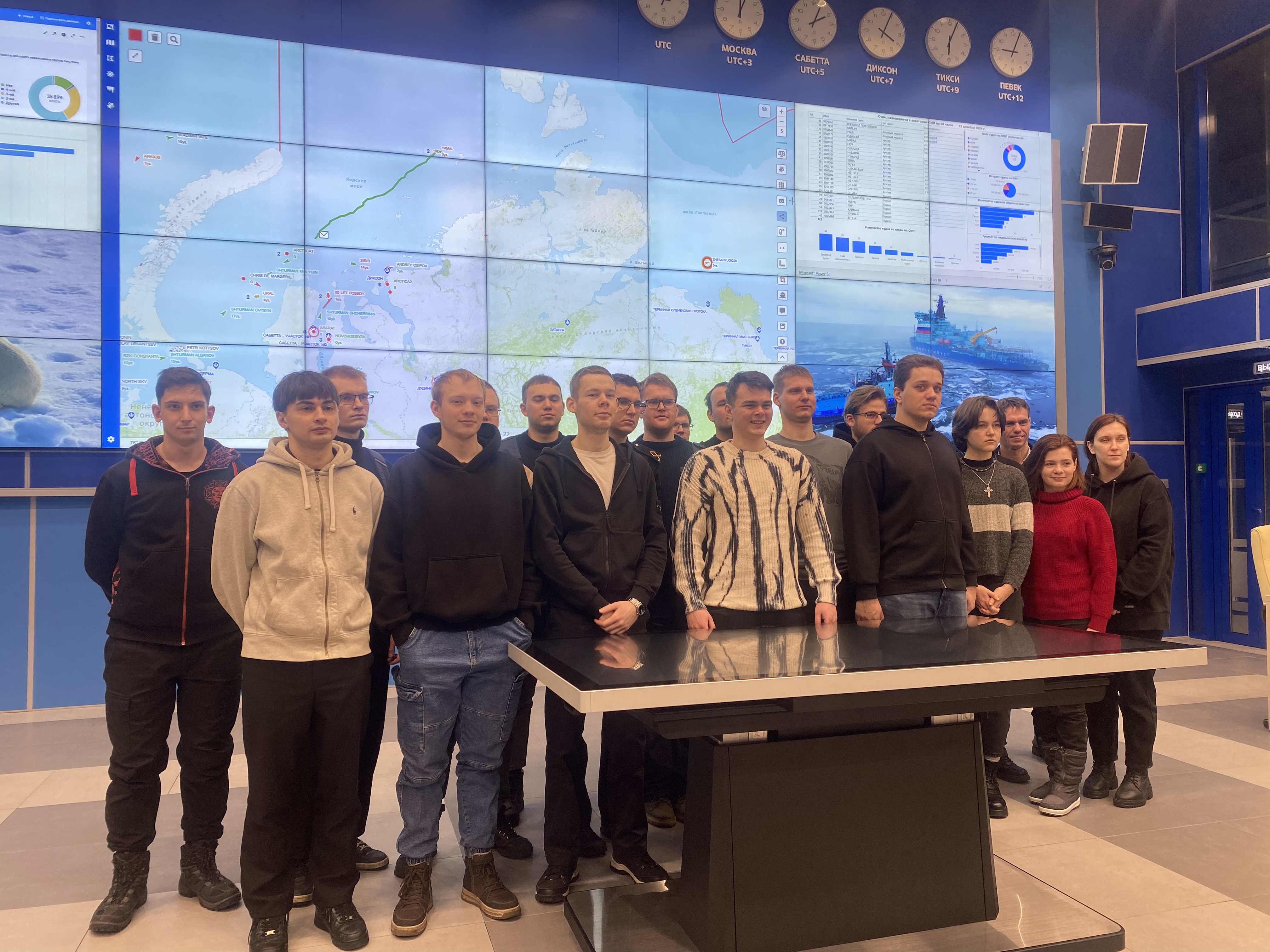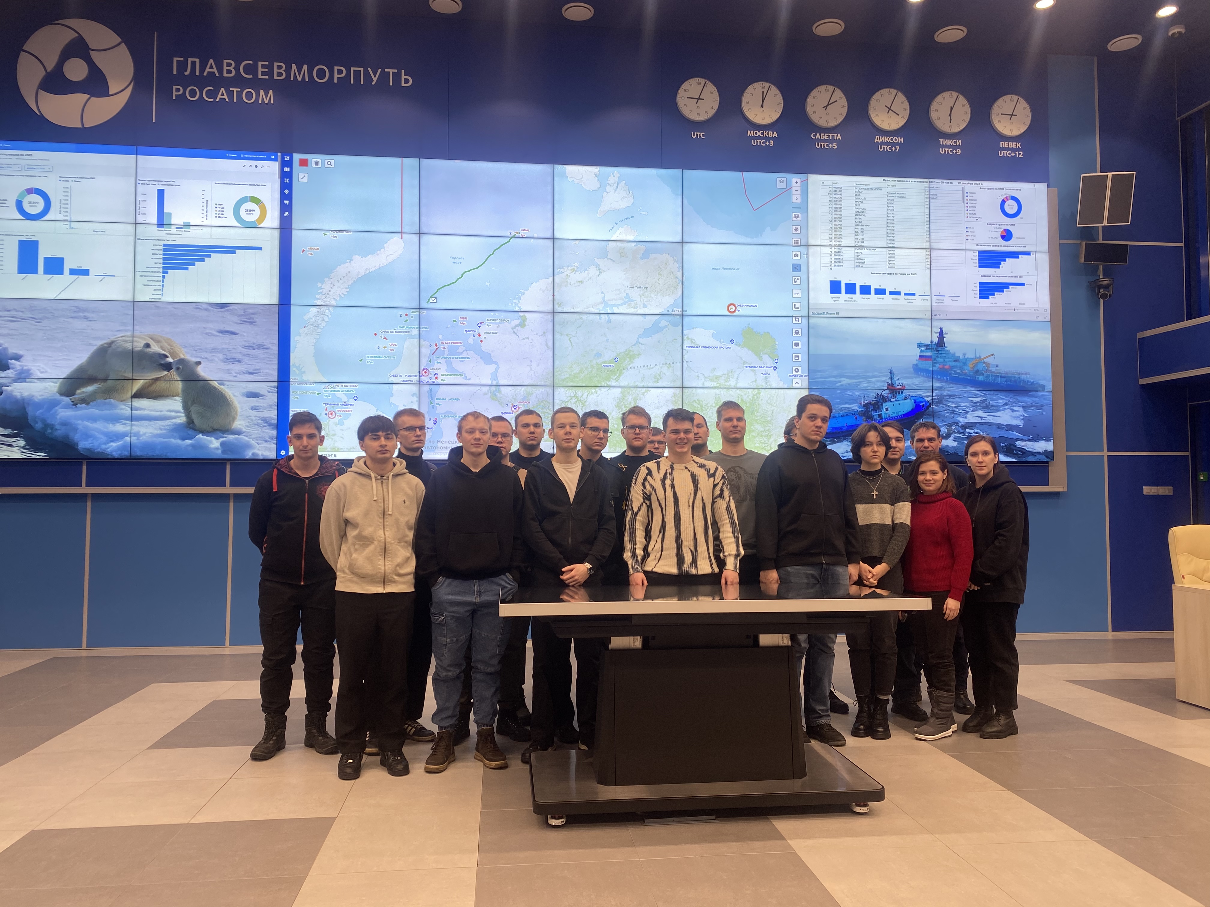 Он рассказал о том, как сам ходил в море капитаном ледокола «Вайгач» и наглядно продемонстрировал студентам возможностями ситуационного центра штаба морских операций ФГБУ «ГлавСевморпуть», где можно в режиме реального времени наблюдать не только местоположение всех атомных ледоколов и контролировать их перемещение, но и получать в онлайн режиме спутниковые данные о ледовой обстановке на Северном морском пути, высоту волны, силу и направление ветра, другие погодные характеристики. Студентам показали, как оценивается состояние льда при помощи спутниковой съемки и с камер, размещенных на судах.