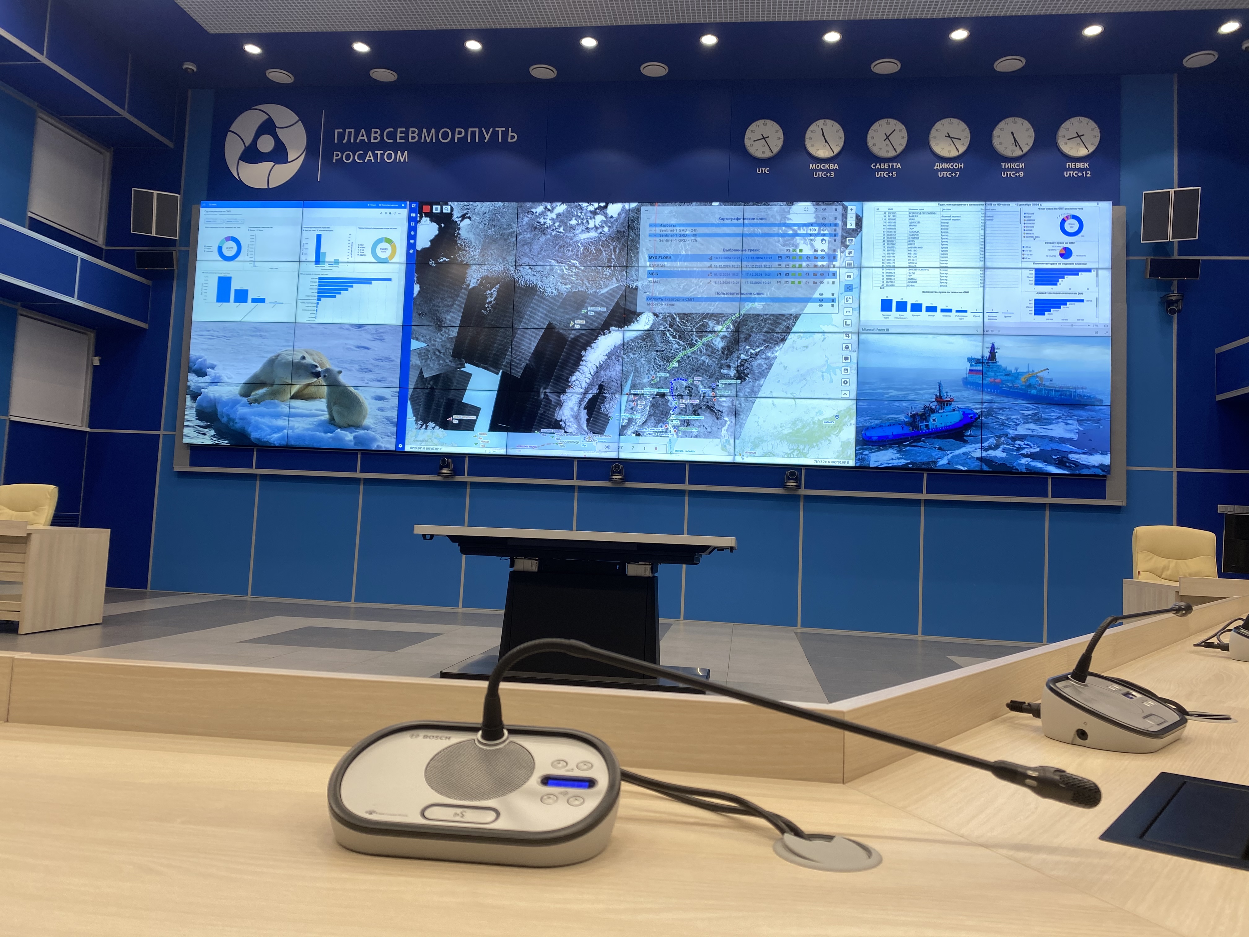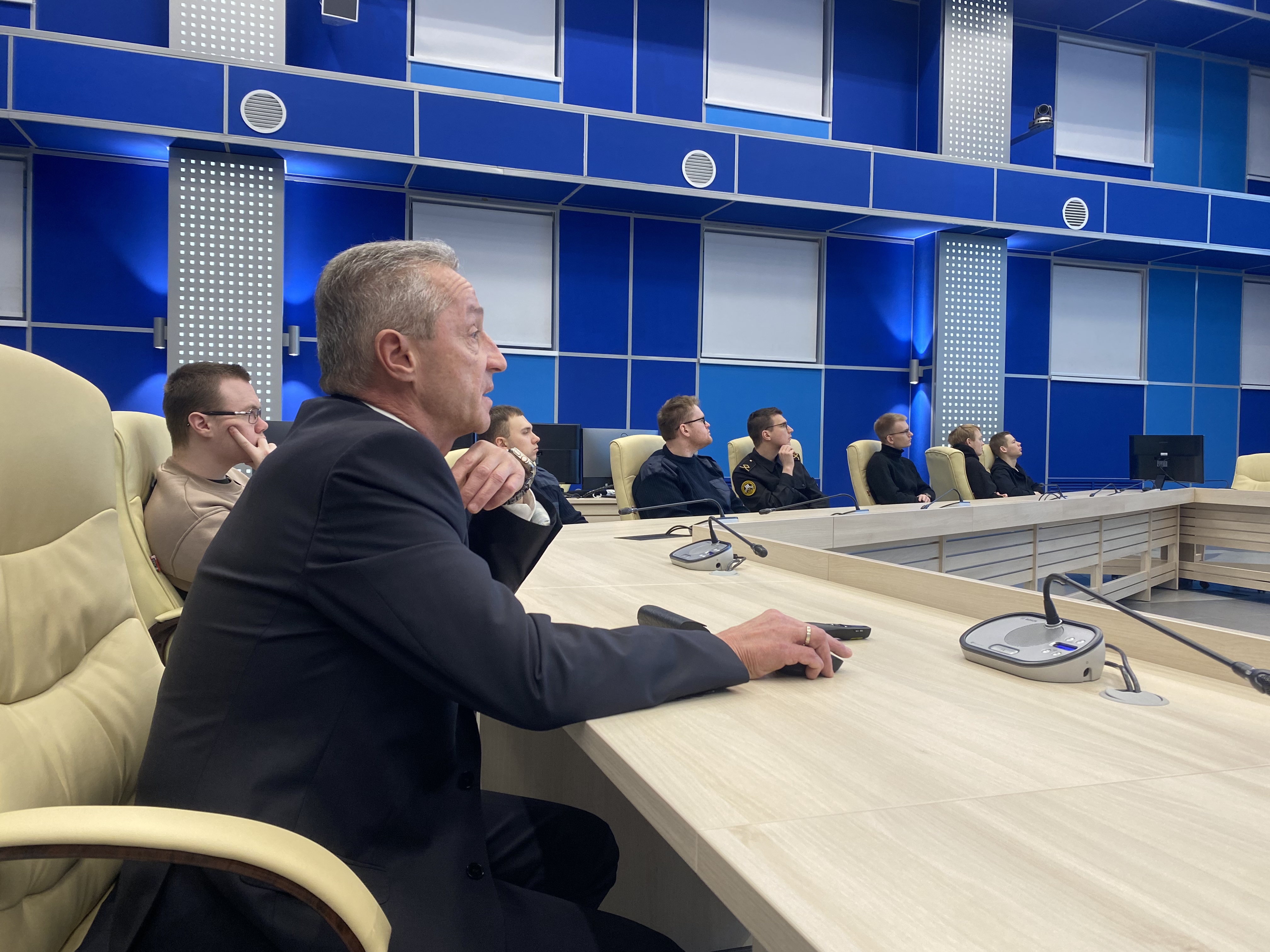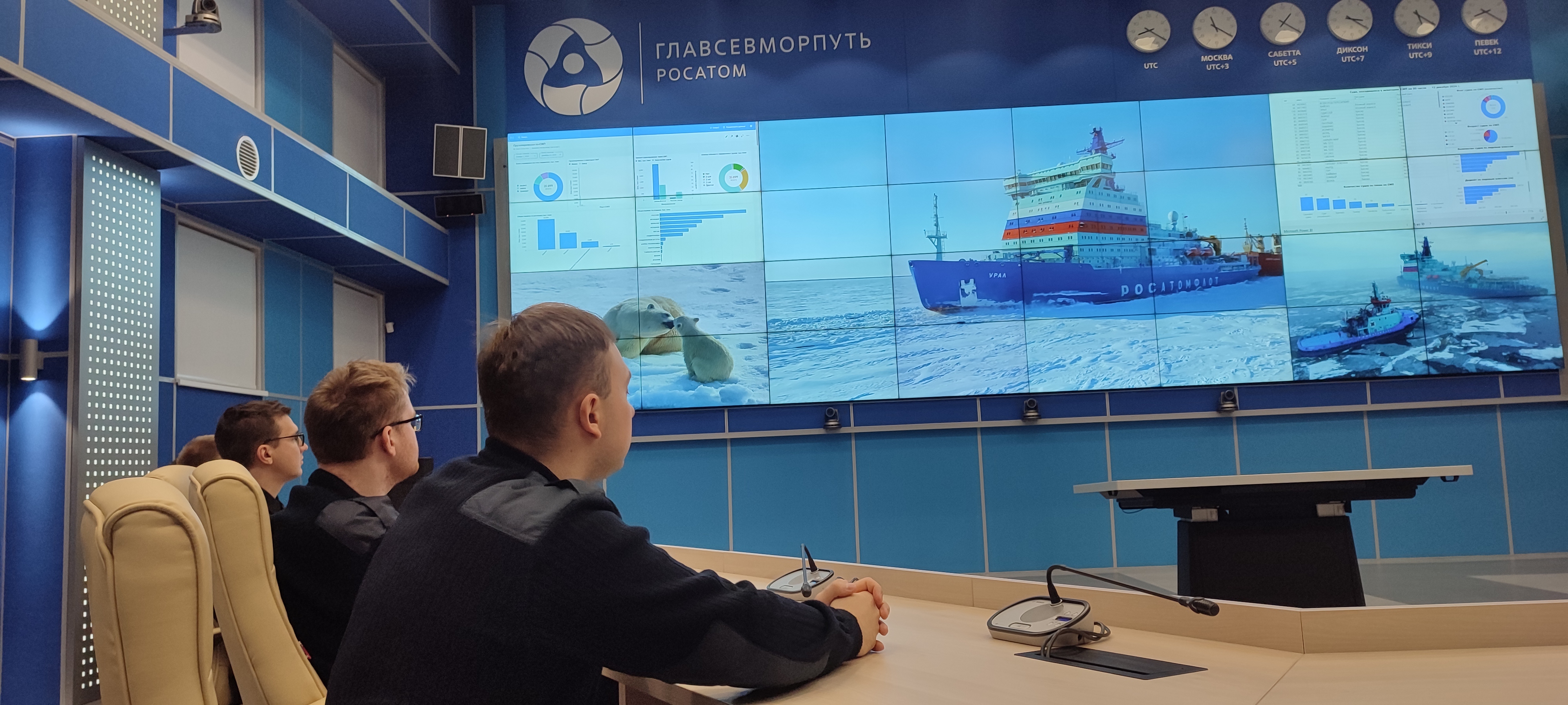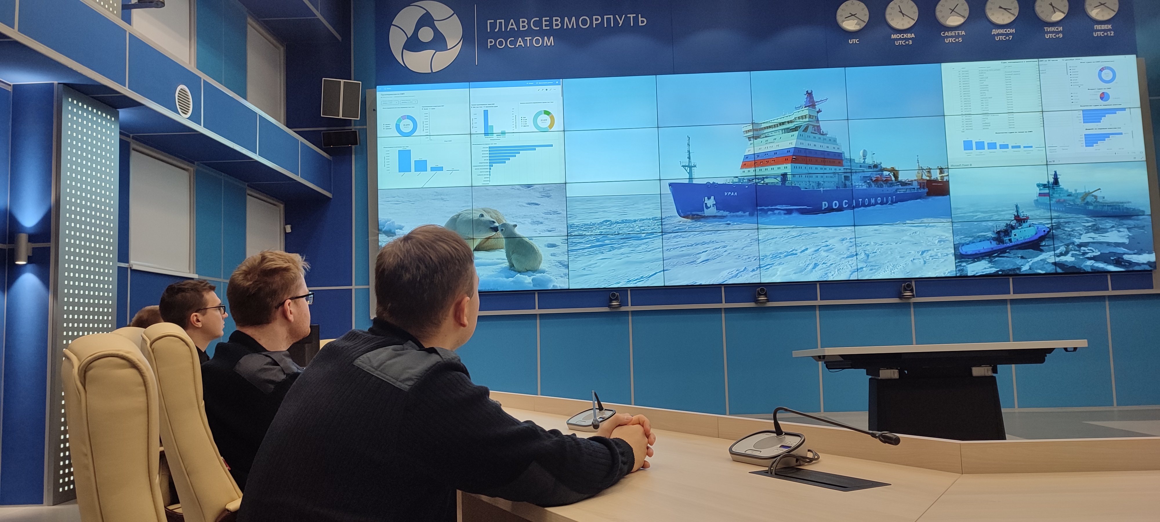 Он рассказал о том, как сам ходил в море капитаном ледокола «Вайгач» и наглядно продемонстрировал студентам возможностями ситуационного центра штаба морских операций ФГБУ «ГлавСевморпуть», где можно в режиме реального времени наблюдать не только местоположение всех атомных ледоколов и контролировать их перемещение, но и получать в онлайн режиме спутниковые данные о ледовой обстановке на Северном морском пути, высоту волны, силу и направление ветра, другие погодные характеристики. Студентам показали, как оценивается состояние льда при помощи спутниковой съемки и с камер, размещенных на судах.